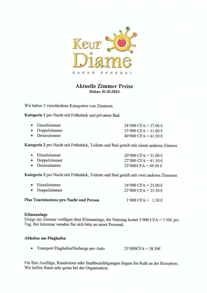 Wir legen Wert auf Sauberkeit und Sicherheit. Die Herberge hat 8 Zimmer in 3 verschiedenen Kategorien. Bitte beachten Sie dazu unsere Preisliste weiter unten oder schreiben Sie uns: keurdiame@outlook.fr . Wir haben Zimmer mit privatem Bad (mit Warmwasser) und solche, welche sich das Bad (mit Warmwasser) teilen. Klimaanlage auf Anfrage in 5 Zimmern möglich, alle Zimmer haben Ventilatoren. Die Fenster sind mit Moskitonetzen gesichert, über den Betten sind ebenfalls Moskitonetze montiert. Das Frühstück ist im Zimmerpreis inbegriffen. Für Mittagessen oder Abendessen gibt es verschiedene Restaurants in der Umgebung, in jeder Preisklasse. Auf unserer schönen Terrasse mit Blick auf das Meer und in unserem gemütlichen Garten lässt sich gut verweilen.