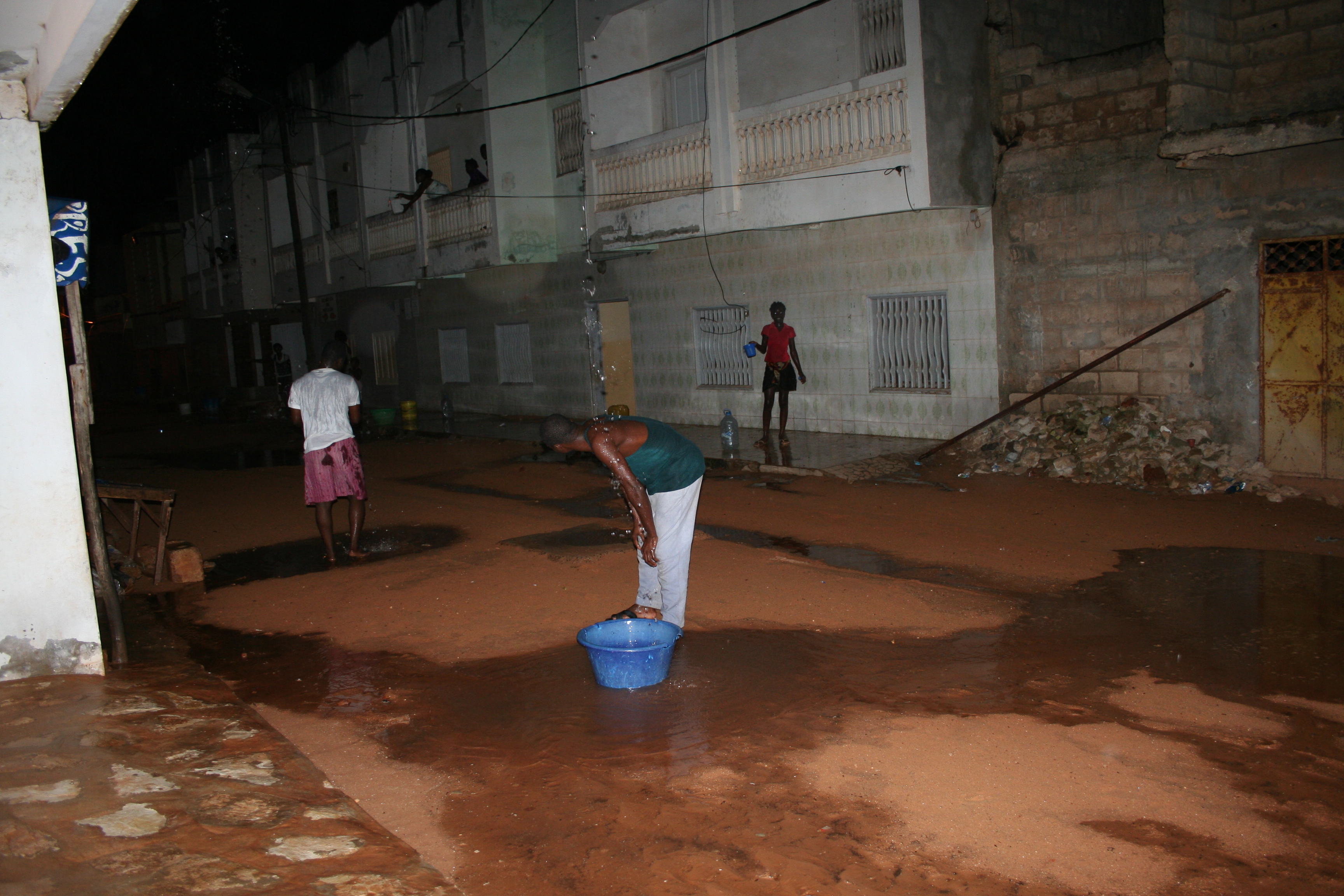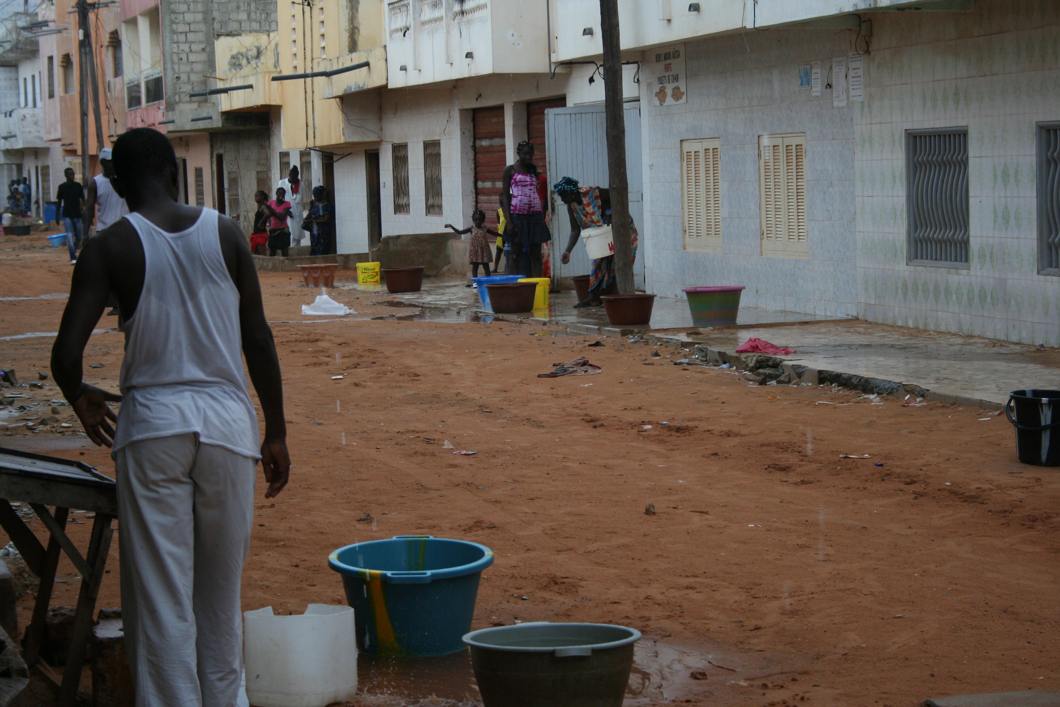 Die arme Familie von gegenüber, die in einem noch nicht fertig gebauten Haus ohne Wasser und Strom wohnt, kommt vor mein Haus. Dort prasselt das Wasser aus der Abflussrinne der Terrasse wie ein Wasserfall herunter. Die Kinder stellen sich darunter, lachen und nehmen eine erfrischende Dusche. Die Frauen kommen mit Plastikbecken und füllen diese, damit sie die Wäsche waschen können. Es herrscht Freude und Uebermut. Auf meiner Terrasse hat sich so viel Wasser angesammelt, dass es noch mindestens eine halbe Stunde geht, bis die Abflussrinne versiegt. Auch die Talibée von gegenüber kommen, waschen sich und ihre Kleider. Die Kinder klatschen, singen, tanzen. In meiner Strasse an jeder Abflussrinne ein kleines Fest. Bald schon ist der Himmel wieder klar und die Sonne kommt mit ihrer ganzen Kraft hervor. Innert weniger Stunden hat sie das Wasser aufgesaugt, der Sand ist wieder trocken und weht in der leichten Briese davon.