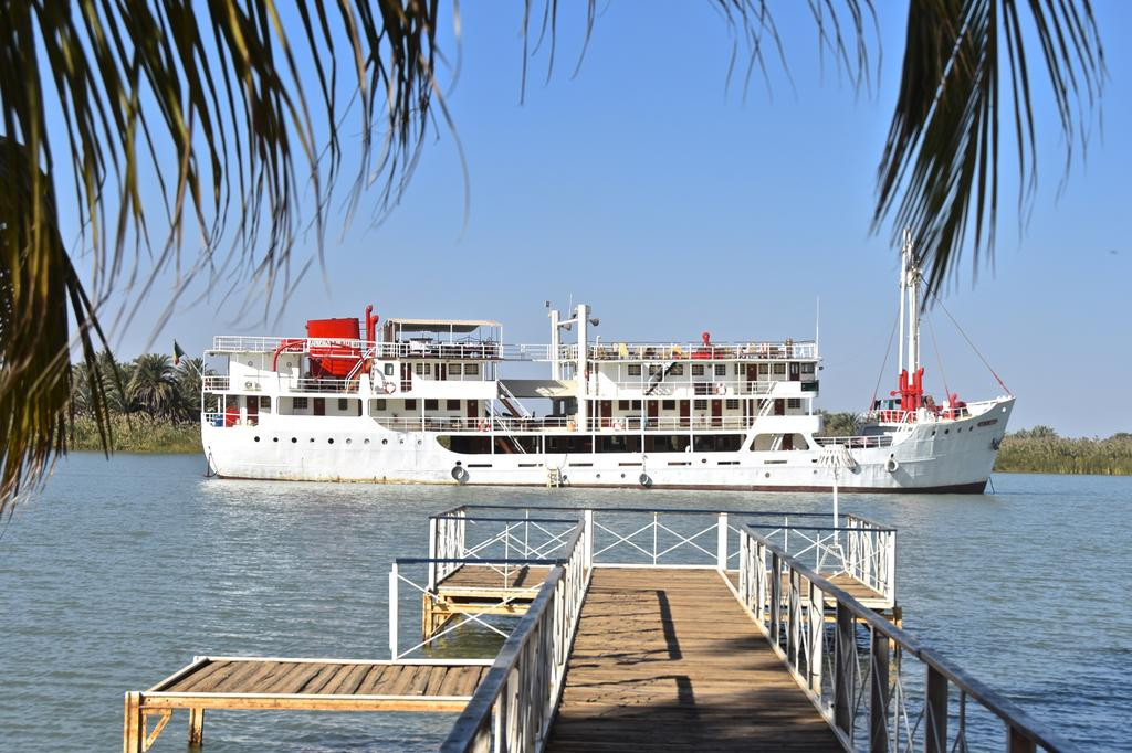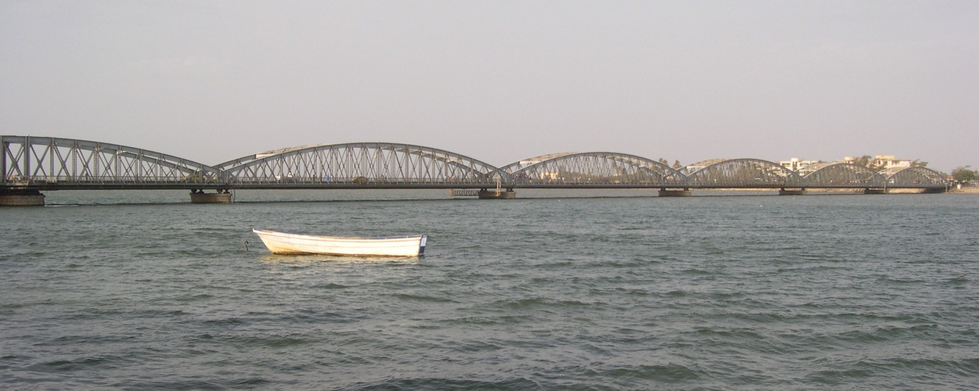 Wir verlassen St. Louis über die altehrwürdige und berühmte Eisenbrücke, welche von Gustav Eiffel, dem Erbauer des Eifelturms gebaut wurde und das Festland mit der ersten Niderlassung der Franzosen verbunden hatte. Ein Wahrzeichen der Stadt. Die Eisenbrücke ist eine Drehbrücke, die es grösseren Schiffen erlaubt, den Fluss von der Flussmündung bis hinauf nach Podor zu befahren. Früher wurde der Fluss als Transportweg benutzt, um die Waren vom Landesinneren zu den Handelsschiffen zu bringen. Heute ist es die Bou El Mogdad, ein Flussdampfer, welcher zu einem kleinen Kreuzschiff ausgebaut wurde, mit welchem man die vielen Sehenswürdigkeiten an den Ufern des Senegal-Flusses bis nach Podor bequem bereisen kann.