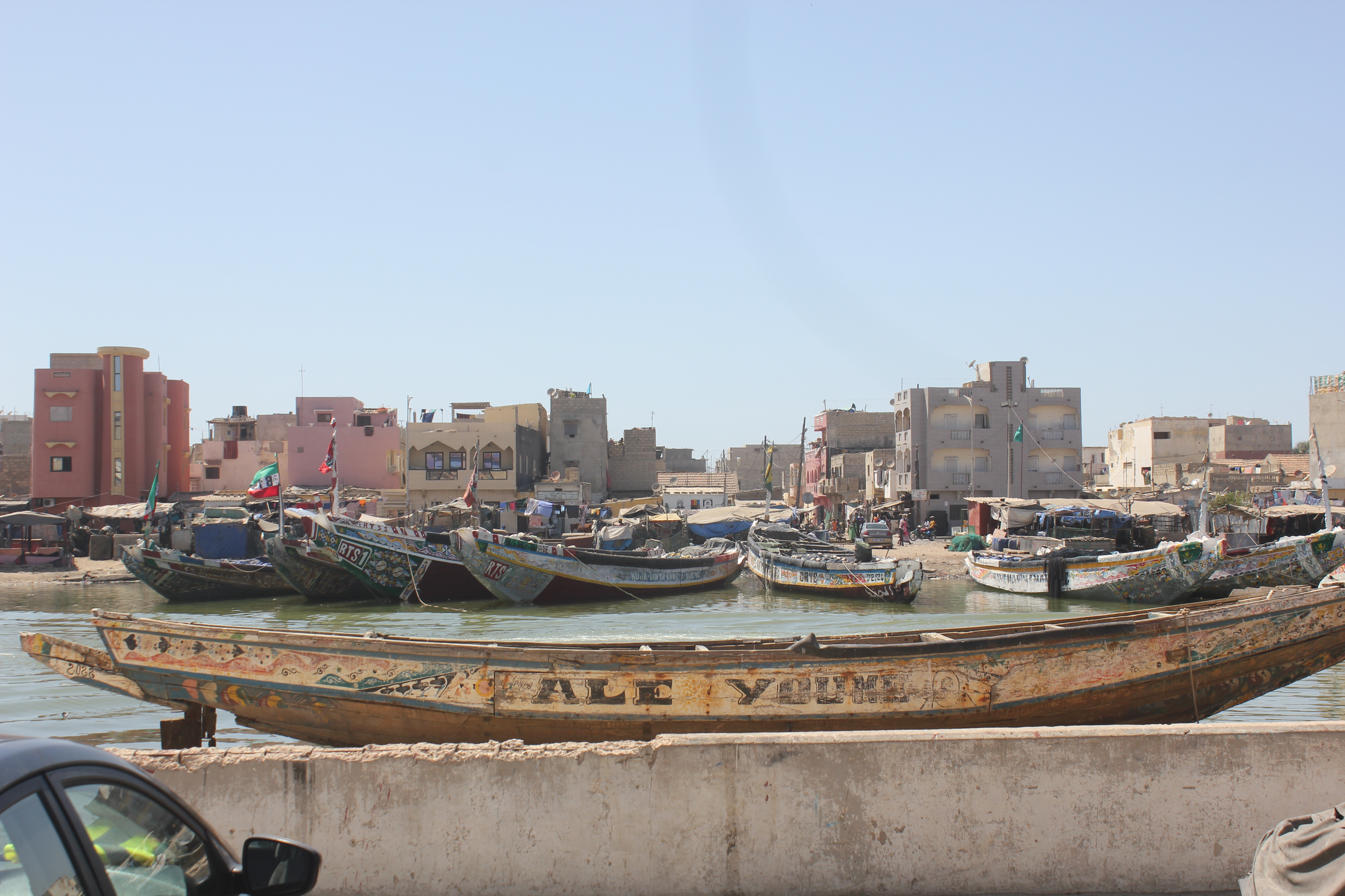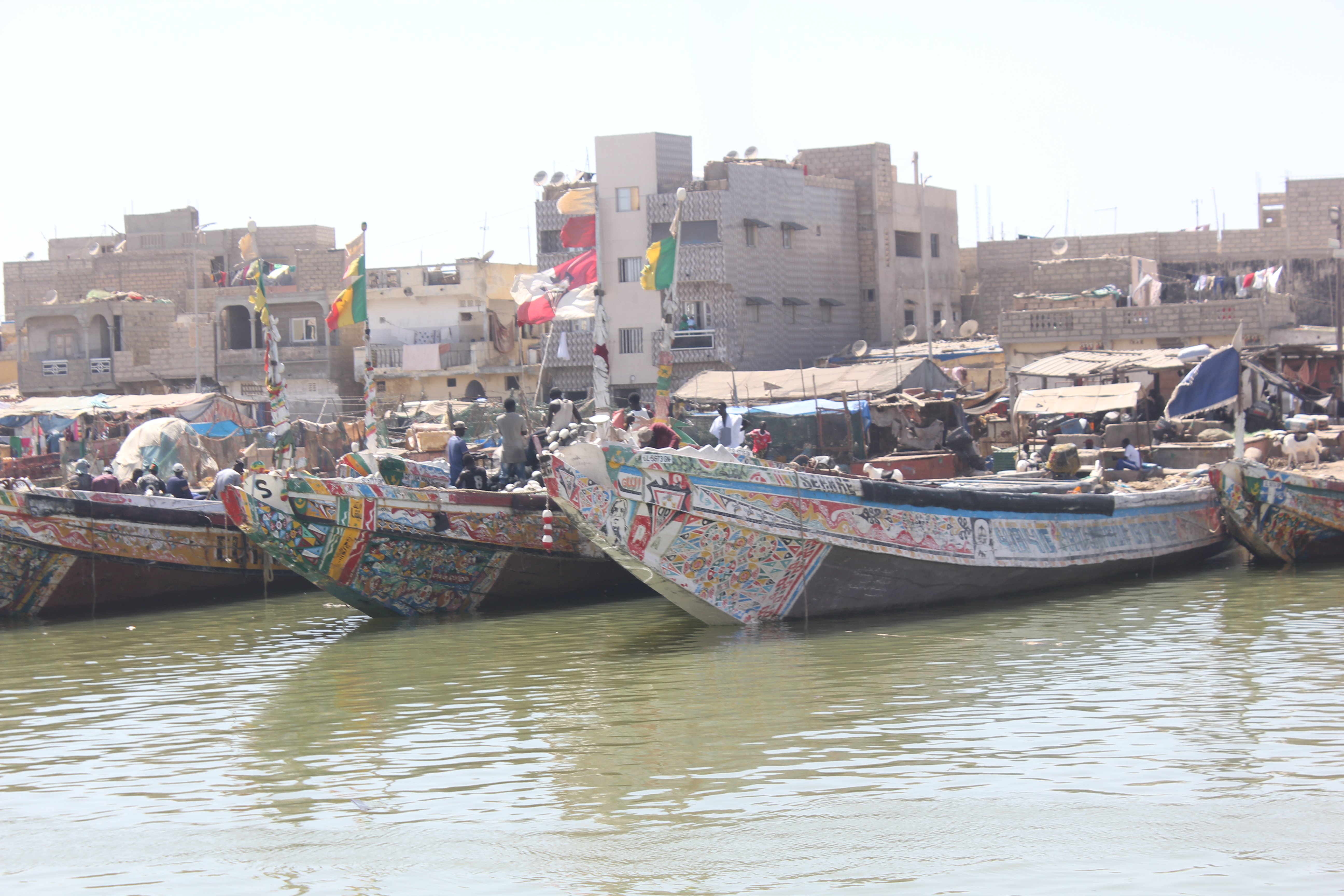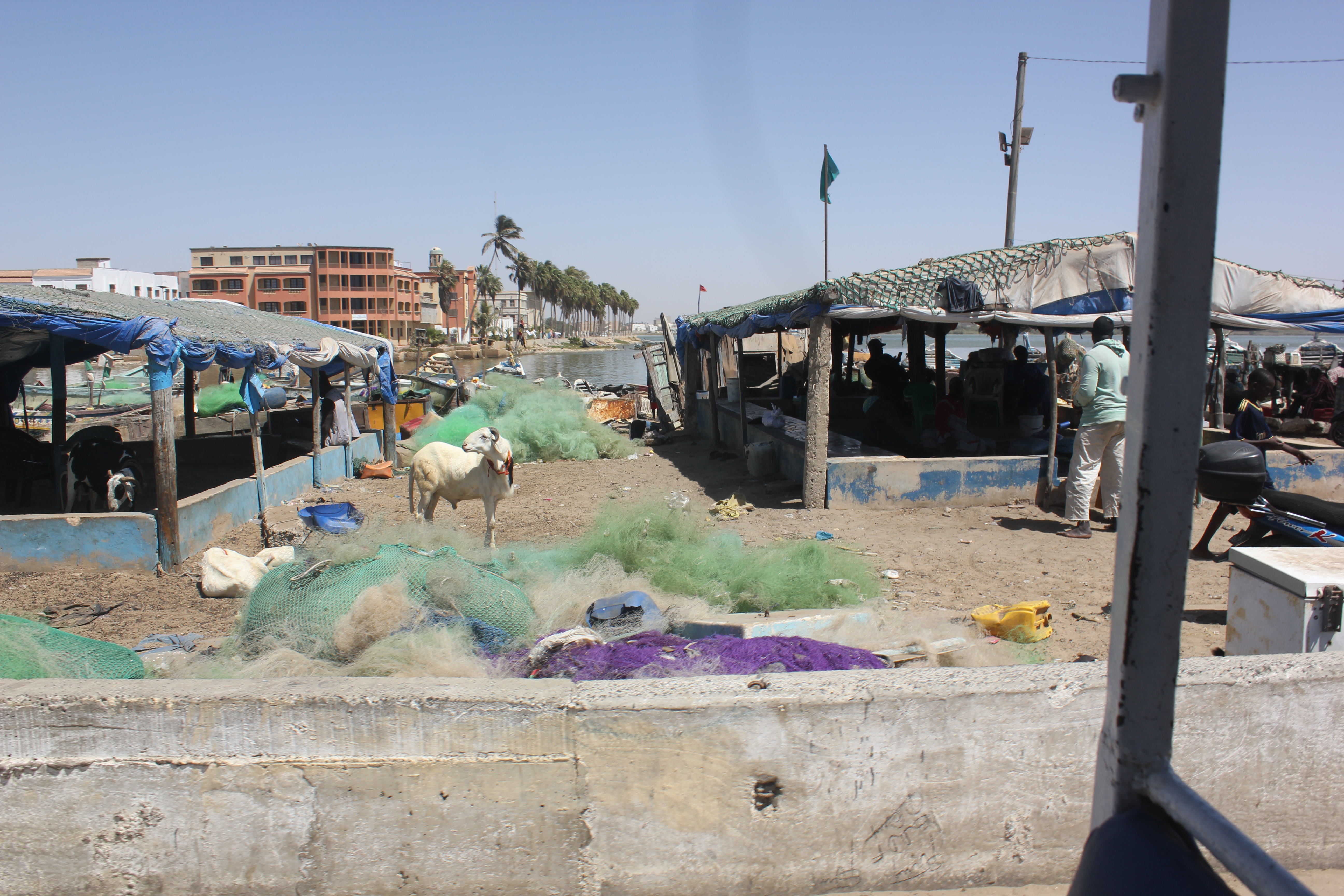 Ein Anziehungspunkt ist auch das Fischerdorf „Guet Ndar“ welches sich gegenüber der Altstadt-Insel, durch 2 Brücken verbunden auf der Landzunge „Langue de Barbarie“ befindet. Die Landzunge wird auf der Inselseite vom Fluss Senegal und auf der anderen Seite vom Meer begrenzt, auf welchem die Bewohner des Fischerdorfes mit Fischfang ihr täglich Brot verdienen. Daher sind auf der Flusseite, im Fischerhafen und Fischmarkt unzählig der riesigen, meerestauglichen Piroggen zu bewundern. Ebenso die Fischerfrauen, welche die Fische in Empfang nehmen, ausputzen und zum Verkauf anbieten. Indessen sind die Männer dabei, ihre Boote zu unterhalten, die Netzte zu flicken oder auch nur zu diskutieren. Andere tragen Lasten auf dem Kopf vom Schiff ans Land oder in die Stadt. Es herrscht ein reges, chaotisches Treiben, es wird geschwatzt, gehandelt, geschimpft, noch viel öfter gelacht. Und zwischen all‘ dem Chaos und den vielen Menschen, spielen eine Unmenge von Kindern mit allem was sie so finden können. Buben schnitzten mit einem kleinen Messer aus Holzstücken kleine Piroggen und spielen Fischfang, andere müssen ihren Vätern helfen, derweil die Mädchen bei den Müttern sitzten, mit dem Verkauf helfen oder zwische all‘ den Waren Fangen oder Gummitwist spielen. Kurz, ein lautes, buntes, geschäftiges Treiben allerorten.